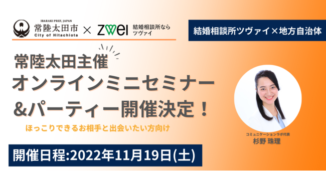 業界最多となる全国50店舗の結婚相談所を運営する株式会社ZWEI(代表取締役社長:中野 大助)は、2022年11月19日(土) に、常陸太田市オンラインミニセミナー&婚活パーティーを開催します。昨年に続き、当社は常陸太田市において「一組でも多くの幸せを育む」ため、婚活領域における支援を継続してまいります。