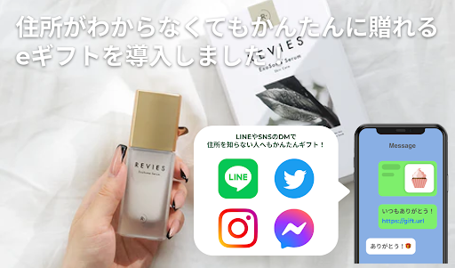気軽にギフトを送りたい方や、離れて暮らす家族や友人に贈りたいという方にとてもぴったりなアプリだと思い、今回「All in gift」を導入させて頂きました。ECでしか販売していないからこそ、「All in gift」を通して皆様にREVIESを楽しんで頂きたいです。