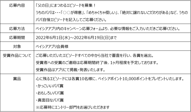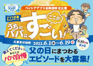 株式会社ベイシア(本社:群馬県前橋市、代表取締役社長:相木孝仁)は、6月1日(水)~6月19日(日)の期間に、ベイシアアプリ内で「うちのパパはここがすごい!」と題して、父の日にまつわるエピソードを募集いたしました。たくさんのご応募をいただき、誠にありがとうございました。このほど受賞作品を決定しましたので発表いたします。