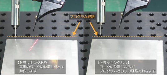 新開発したセンシング技術による溶接経路の自動補正機能です。従来は板金溶接作業をロボットで自動化する際に、ワークごとの溶接位置のばらつき、溶接中のワークの歪みによる位置ずれが起こるため、その都度プログラムを修正し、ロボットのティーチングを行わなければなりませんでした。ワークの歪みを物理的に抑えようとすると、専用の治具が必要になり、製作するための時間やコストも膨大なものになります。