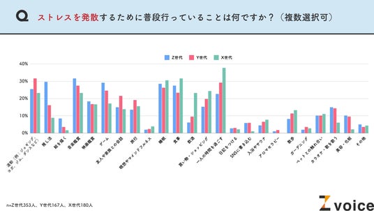 上記に関連してストレス発散の方法を尋ねたところ、各世代の第1位は、Z世代が「音楽鑑賞(31.7%)」、Y世代が「運動(31.7%)」、X世代が「一人の時間を過ごす(37.8%)」と世代ごとに特色が出る結果に。