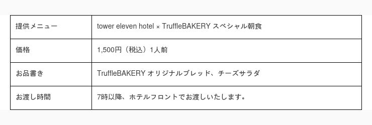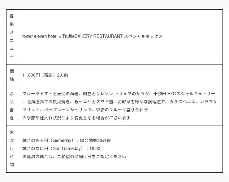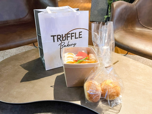 エスコンフィールドHOKKAIDO(エスコンフィールド)内、tower eleven hotel(タワー・イレブン・ホテル)では、Fビレッジ沢エリアに店舗を構える「TruffleBAKERY BAKERY & RESTAURANT」とコラボレーションしたオリジナルメニューを提供しております。ホテルフロントで受け取るデリバリーサービスとして利用可能で、宿泊予約とともに予め注文することで出来立ての食事をお召し上がりいただけます。