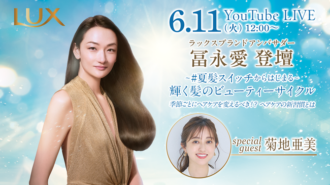 ラックスは、新たなヘアケア習慣「輝く髪のビューティーサイクル」を提唱するにあたって、この「ラックス リペア&さっぱり シリーズ」の発売を第1弾とします。そこで今年度のラックスブランドアンバサダー冨永愛さんをはじめ、スペシャルゲストとしてタレントの菊地亜美さんと美髪診断士の齊藤あきさんをお迎えしたトークイベントをLUX公式YouTubeにて2024年6月11日(火)12:00(正午)より開催します。イベントでは、これまで気づけなかった季節ごとの髪悩みや、どんな季節でも1年を通して手軽にツヤ髪をキープするための新しいヘアケア習慣についてトークセッションを繰り広げていただきます。