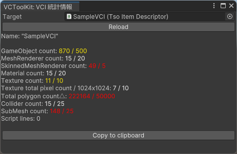 作成したVCIのパフォーマンスに関する統計情報をUnityEditor上で確認することができます。統計情報から負荷が高いことが予想される場合は、その項目が色付きで表示されます。
