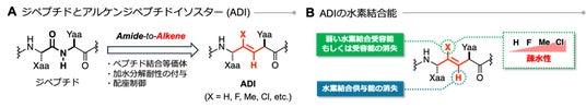 アルケンジペプチドイソスター (ADI) は、ペプチド結合を結合長と結合角がよく似た炭素-炭素二重結合に置換した構造的に類似したバイオイソスターです。これまでの研究から、ペプチドにADIを導入すると、酵素による分解を受けにくくなるだけでなく、ペプチドの形(立体構造)を整えることが可能であることが報告されてきました。本研究では、これまで十分に調べられてこなかったADIの「水素結合の性質」に着目し、それが膜透過性にどのような影響を与えるのかを検証しました (図1)。