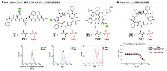 図3. (A) FACS解析を用いた鎖状・環状ペプチドの細胞膜透過性評価 (B) NanoClickアッセイによる環状ペプチドの細胞膜透過性評価