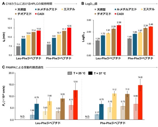 まず、アミノ酸2残基のジペプチドモデルを用いて、これまでにペプチドの膜透過性を向上させる骨格として活用されてきたN-メチルアミド、エステル、チオアミドとCADIの物性を比較しました。具体的には、高速液体クロマトグラフィー (HPLC) によるC18カラムにおける保持時間測定、LogD7.4値の算出および人工膜透過性評価 (PAMPA) (注6) を行いました (図2)。その結果、CADI型は最も高い疎水性を示し、いずれのジペプチドにおいても最も高い受動的膜透過性を示しました。さらに分子動力学計算の結果、CADI骨格周囲では水素結合ネットワークが顕著に弱まっており、この高い疎水性が「脱水和」を促進することで膜透過のエネルギー障壁を下げていることが示唆されました。