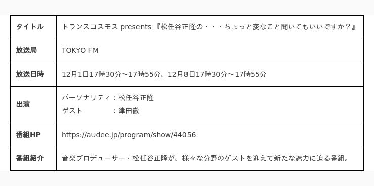 メタバースWeb3のコンテンツ企画・ディレクションを行うVma plus(ブイマプラス)株式会社(本社:東京都品川区、代表:津田徹 以下、Vma plus)は、TOKYO FMで放送中のトランスコスモス presents『松任谷正隆の・・・ちょっと変なこと聞いてもいいですか?』(毎週金曜17時30分~17時55分)に代表取締役 津田徹が出演いたしますことをお知らせします。