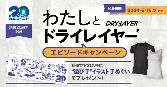 「遊び手=創り手」の国産アウトドアメーカー、株式会社finetrack(代表取締役:金山洋太郎)は、創業20周年を記念し日頃の感謝の気持ちを込めて、2024年4月1日(月)よりドライレイヤーシリーズを対象としたノベルティプレゼントキャンペーンとエピソード投稿キャンペーン、2つのキャンペーンを開催いたします。
