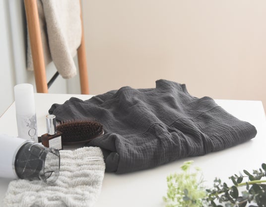 元々シワ感があるガーゼ素材なので、畳みジワも気になりにくく、クルクル丸めて収納できます。収納スペースでもかさ張らないので、洗い替え用に複数枚揃えても◎。