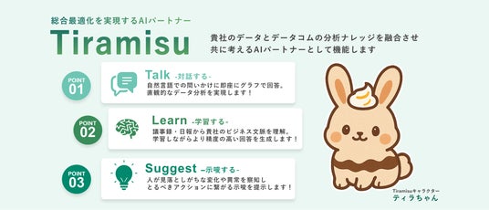 本展示では、当社の強みである分析基盤と30年以上にわたる小売特化のナレッジを活かしたAIソリューション「Tiramisu」をご紹介します。「Talk(対話する)」「Learn(学習する)」「Suggest(示唆する)」の3つのアプローチで、分析から改善提案までを自走します。