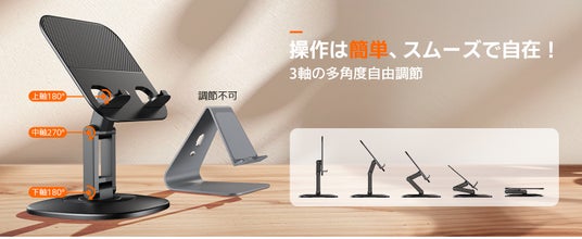 このiPadスタンドは、100%あらゆる角度とシーンに対応します。上軸180°、中軸270°、下軸180°、底座360°回転と、各関節の可動性を最大限に発揮。また、L型レンチで簡単に角度調整が可能で、操作はスムーズで快適です。動画通話、イラスト制作、リモートワーク、映画鑑賞、ヨガやストレッチ、FPSゲームなど、さまざまなシーンで活躍。この自由調節可能なタブレットホルダーは、きっとあなたの日常に欠かせない存在となるでしょう。