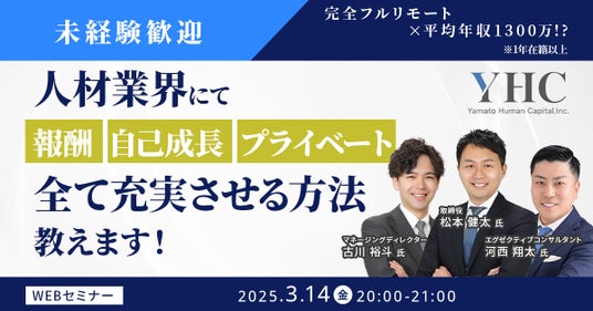 ヤマトヒューマンキャピタル株式会社(本社:東京都千代田区、代表取締役:堀江 大介)は、2025年3月14日(金) 20:00よりオンラインにて、ヤマトヒューマンキャピタル主催ウェビナー『人材業界にて報酬、自己成長、プライベート全て充実させる方法教えます』を開催いたします。