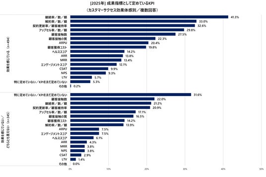一方、未実感層では「特に定めていない/KPIをまだ定めていない」が31.6%と最も多く、明確な指標を持たない企業が約3割超にのぼることが明らかとなりました。「顧客接触数」(22.0%)や「継続率/数/額」(21.2%)が続くものの、効果実感層と比べてアップセル率/数/額など収益指標の活用が低い状況です。顧客維持や解約防止系の指標(解約率/数/額、契約更新率/顧客維持率)も2割前後にとどまり、収益や顧客維持に直結する指標の設定が不十分なまま施策を進めている企業が多いことがうかがえます。このような指標設定の有無や明確度が、カスタマーサクセス施策の方向性やモチベーションを左右し、結果的に効果の差につながっていると考えられます。