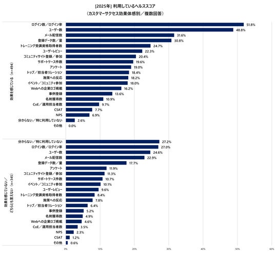一方、効果未実感層は、ヘルススコアの活用自体が不十分である傾向が顕著です。「分からない/特に利用していない」という回答が27.2%と最多であり、ヘルススコアを体系的に設計できていない可能性が高いと考えられます。