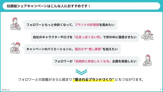 ピクルスが制作した大人気コンテンツ「似顔絵メーカー」を企業専用にカスタマイズし、そのままご活用いただくことで、安価かつスピーディーに“UGC × ブランディング”施策を実現。フォロワーとのエンゲージメント最大化を支援します。