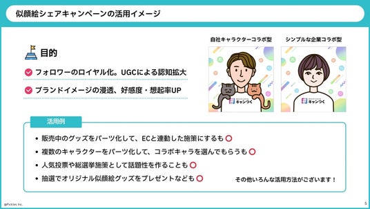 「販売中のグッズをパーツ化して、ECと連動した施策」「複数のキャラクターをパーツ化して、コラボキャラを選んでもらう」「人気投票や総選挙施策として話題性を作る」「抽選でオリジナル似顔絵グッズをプレゼント」...など、様々な活用例が想定されます。