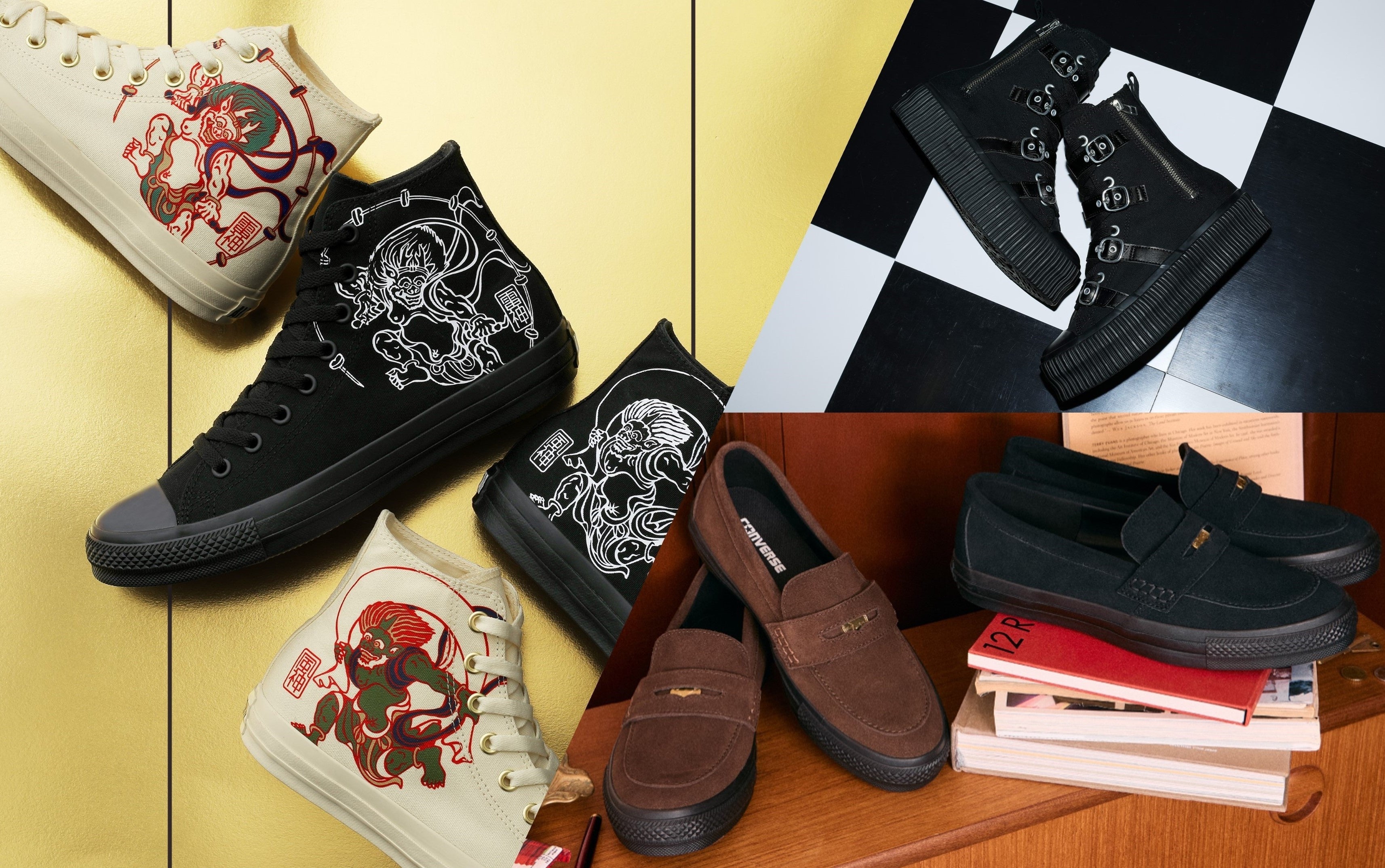 大胆なベルトデザインと厚底ソールが印象的なブラックブーツをモチーフにしたモデル「ALL STAR LIFTED ST Z SHIN-HI」。重厚感のあるルックスにメタルバックルをあしらい、モードかつエッジィな存在感を放ちます。スエードのローファーをモチーフにした「ALL STAR COINLOAFER SU」は、クラシックな佇まいが魅力。柔らかなスエード素材とコンバースらしいラバーソールが融合し、カジュアルにも上品にもマッチします。そして、キャンバス地に風神雷神をプリントしたハイカットモデル「ALL STAR FUJINRAIJIN HI」は、遊び心あふれるグラフィックが、足元からスタイルに個性を添えます。時代を超えて愛されるベーシックなフォルムに、新たなエッセンスを加えた3足が、秋冬スタイルを自由に彩ります。