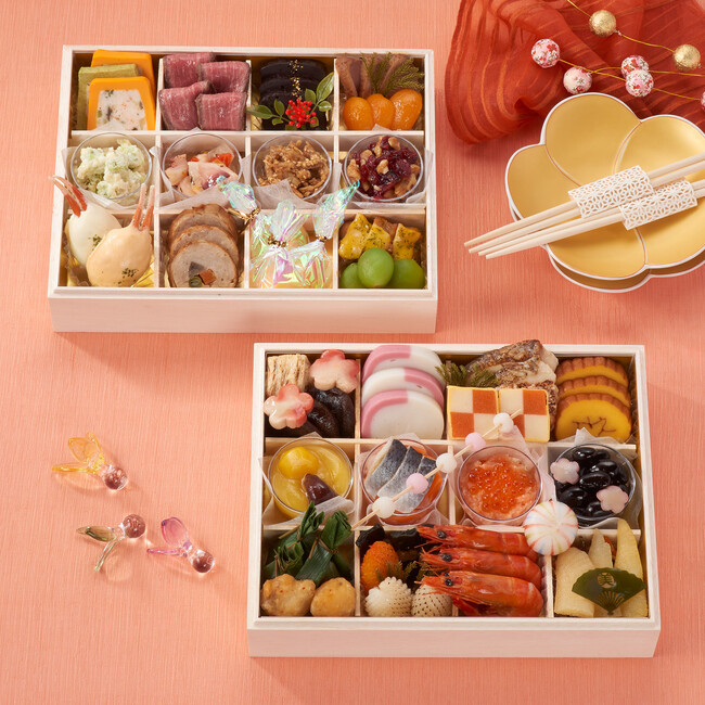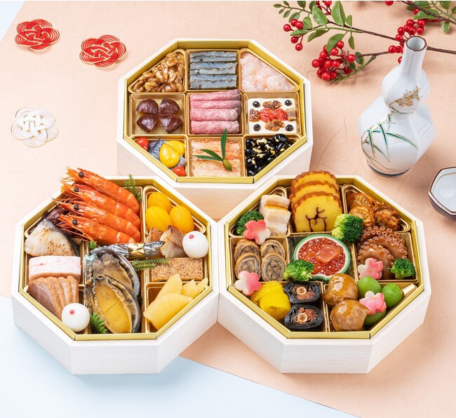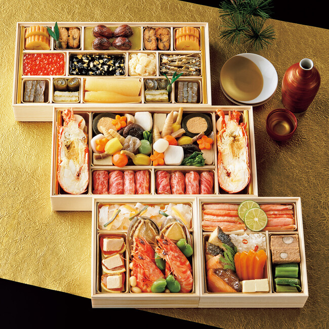 越中伝統のお正月料理やおせちの定番品から、お酒の肴にも好適な料理を彩りよく詰め、日本酒からシャンパーニュまで、和洋どちらでもお召し上がりいただけるラインナップです。