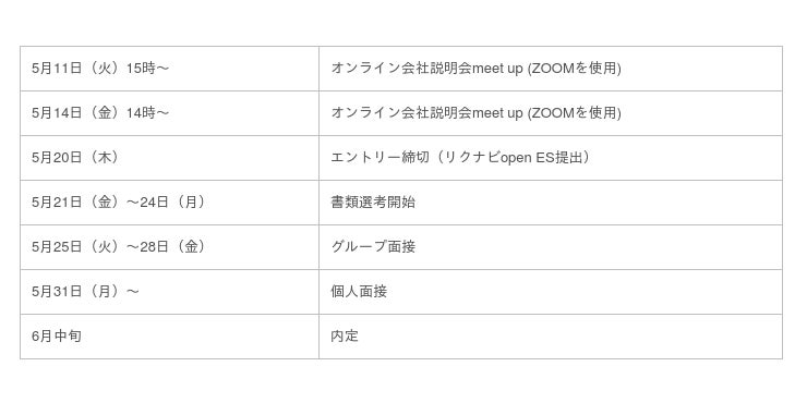 当社は、採用に向けて以下のスケジュールで説明会等を開催していきます。オンラインmeet upは直接お問合せをいただいても構いません。ご興味のある方は、遠慮なくご連絡いただければと思います。
