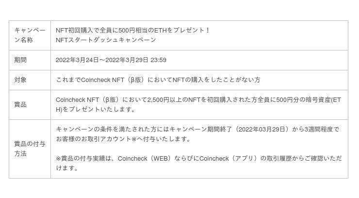 おかげさまで、Coincheck NFT(β版)は、NFTの取扱いを始めて1周年を迎えることができました。これを記念して、Coincheck NFT(β版)では本日より、2,500円以上のNFTを購入された方全員に500円相当のETHをプレゼントするキャンペーンを実施いたします。