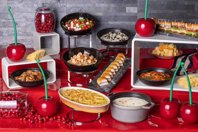 さらに、定評のあるセイボリーアイテムには「アメリカンBLTサンドイッチ」や「アメリカンポテトサラダ、うずら卵のデビルエッグスタイル」、「ニューオーリンズスタイル、エビとチキン、ソーセージのガンボ」など、アメリカ料理を中心に、「グリルドチーズブレッド、チェリーコンポートとブリーチーズ」や「カプレーゼサラダ、チェリートマトとチェリーモッツァレラ」、「チェリーバーベキューチキン」、「ドライチェリーピラフ」など、チェリーを使用した温かいお料理6種、サンドイッチを含む冷たいお料理4種の合計10種類をご提供します。