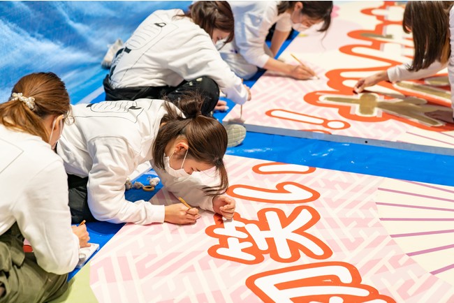 「ニッポン画」を提唱する日本画家で、本学美術工芸学科准教授の山本太郎の指導のもと、総勢28名の学生が約2か月半をかけて仕上げました(制作期間:10月中旬~12月上旬)。景観の在り方や看板制作に関わる「京都市屋外広告物等に関する条例」を、京都市都市計画局 都市景観部 広告景観づくり推進課より指導を受け学ぶことで、「京都らしさ」を再考しながら新春の華やかさを表現するため、色合いには特に工夫が施されています。
