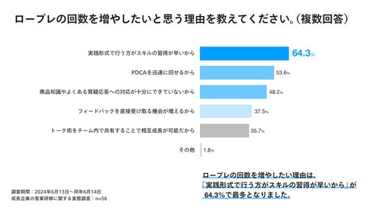 また、「今後、ロープレの頻度をさらに上げていきたいと思いますか。」に「非常にそう思う」「ややそう思う」と回答した方に、「ロープレの回数を増やしたいと思う理由を教えてください(複数回答)」(n=56)と質問したところ、「実践形式で行う方がスキルの習得が早いから」が64.3%、「PDCAを迅速に回せるから」が53.6%、「商品知識やよくある質疑応答への対応が十分にできていないから」が48.2%という回答となりました。