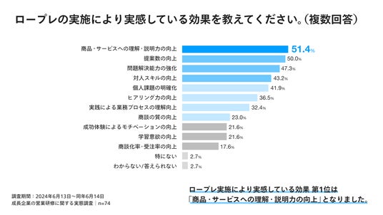また、「ロープレを実施している」と回答した方に、「ロープレの実施により実感している効果を教えてください。(複数回答)」(n=74)と質問したところ、「商品・サービスへの理解・説明力の向上」が51.4%、「提案数の向上」が50.0%、「問題解決能力の強化」が47.3%という回答となりました。