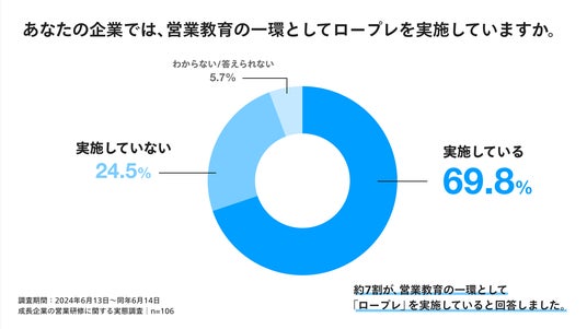 「あなたの企業では、営業教育の一環としてロープレを実施していますか。」(n=106)と質問したところ、「実施している」が約7割の69.8%、「実施していない」が24.5%という回答となりました。