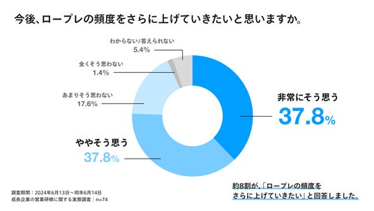 「ロープレを実施している」と回答した方に、「今後、ロープレの頻度をさらに上げていきたいと思いますか。」(n=74)と質問したところ、「非常にそう思う」が37.8%、「ややそう思う」が37.8%が回答し、7割以上がロープレの頻度を上げたい意向を持っていました。