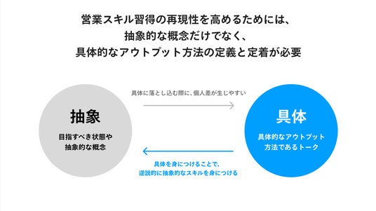 営業担当者が抽象度の高い営業スキルを身につける際、概念は理解できているが、具体的にどのようにアウトプットすればよいか分からないという課題が生じやすいです。そのため、営業スキルが発露された状態であるトークの型を定義し、それを身につけることで、スキル定着の再現性を高めることが可能となります。つまり、まずは「どのようなトークを身につけるべきか」ということを定義することが必要です。