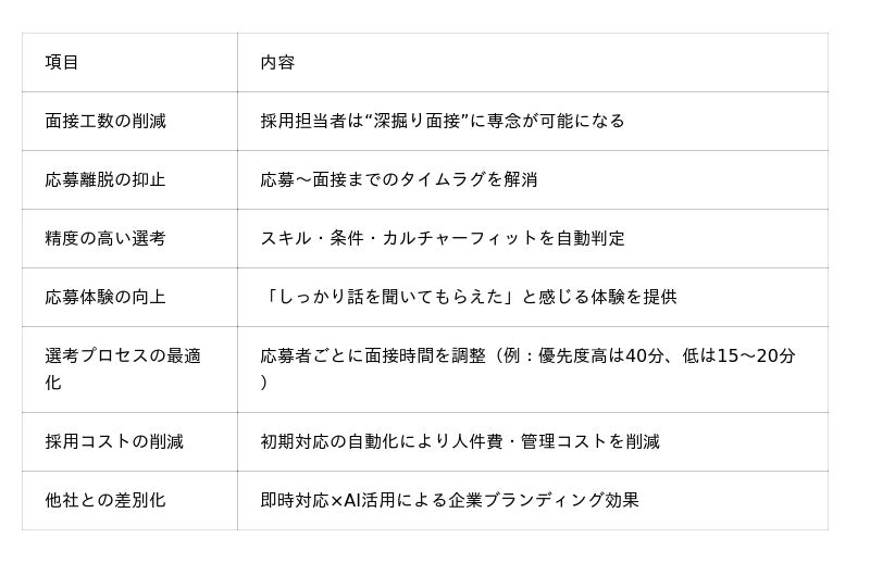 これにより、応募者のモチベーションが最も高いタイミングを逃さず即時対応できるため、選考スピードの向上に加え、歩留まり(離脱率)の改善が期待されます。