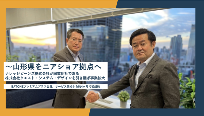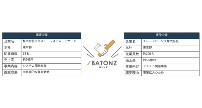M&A総合支援プラットフォーム「BATONZ(バトンズ)」を運営する株式会社バトンズ(本社:東京都千代田区、代表取締役社長 兼 CEO:大山敬義、以下バトンズ)は、バトンズ経由で、システム開発会社であるナレッジビーンズ株式会社(本社:東京都港区、代表取締役:河西賢二、以下ナレッジビーンズ)が、同業他社である株式会社クエスト・システム・デザイン(本社:東京都千代田区、代表取締役:阿部一志、以下クエスト・システム・デザイン)を譲り受けたことをお知らせします。ナレッジビーンズはバトンズが7月30日に開始した積極的にM&Aで企業/事業の買収を検討する法人向けサービス「BATONZプレミアムプラス会員」の会員であり、サービス開始から初の成約となりました。