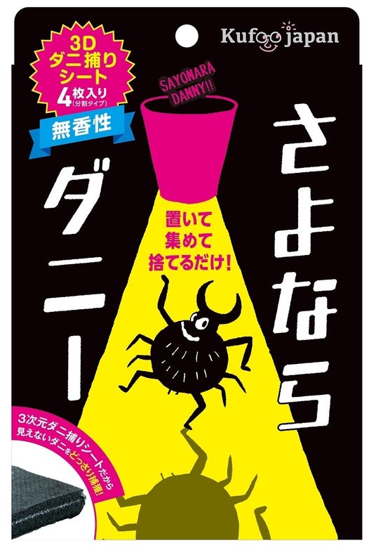 家族にやさしい、殺虫成分不使用のダニ対策ブランド。メイン商品の「さよならダニー3Dダニ捕りシート」は、「置いて集めて捨てるだけ」でお家のダニ対策ができるダニ捕りシートです。コンパクトサイズのシートを置くだけで、お家のダニを効率的に捕獲し、ダニの繁殖を抑制。ダニの発生が予想される、枕、ソファ、カーペット等のダニ対策を、簡単に確実にして頂けます(※1)。手軽さと実感力で多くのお客様に支持され、「さよならダニーは」5年連続ダニ用殺虫剤部門売上NO.1(※2)を獲得。ブランドが誕生した2018年からのダニ商材市場の拡大を牽引し続けています。さらに、「さよならダニー」をご愛用頂いている1万人以上のお客様の声をもとに商品開発を重ね、シリーズ史上最高、1枚当たり57万匹(※3)のダニが捕獲できる「さよならダニーDX」を、2024年2月より販売開始しております。