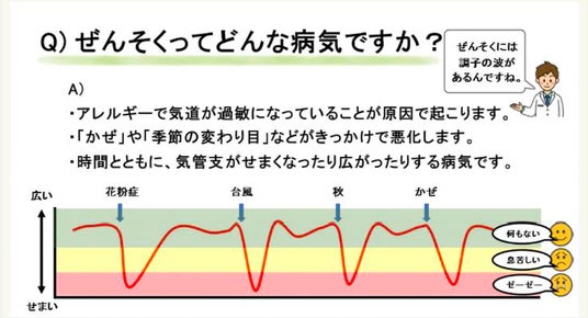 気管支喘息は呼吸の通り道である気道(気管、気管支)にアレルギーによる炎症が起こり、気道が過敏になることで、「かぜ」「季節の変わり目」「寒暖差」などの刺激に対し、気管支がせまくなり咳や痰が出て、気道が狭くなることを繰り返す病気です。