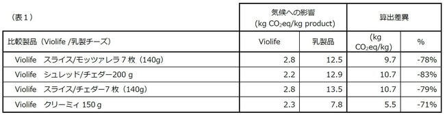 表1は「Violife」4製品と乳製品のチーズについて製品1kg当たりのCO2排出量を評価したものです。「Violife」は2.2~2.8kgで、日本で一般的に販売されている乳製品のチーズよりも71~83%少ないことが明らかになりました。