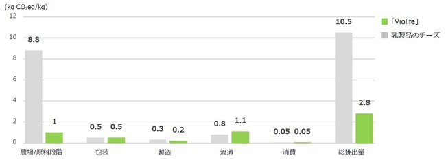 グラフは「Violife」と乳製品のチーズについて、生産から廃棄まで工程別(左から農場/原料段階、包装、製造、流通、消費。右端は総排出量)にCO2排出量を評価したものです。「Violife」は乳牛を生育する工程が不要であるため、農場/原料段階で環境負荷を大きく抑制することが明らかになりました。