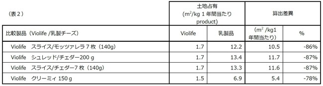 表2は「Violife」4製品と日本で一般的に販売されている乳製品のチーズについて、製品1kg/1年間当たりに必要な土地面積を評価したものです。Violifeは1.5~1.7m2で、乳製品のチーズよりも78~87%少ないことが明らかになりました。