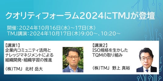 コールセンター・バックオフィス(事務処理センター)の構築・運営を行うセコムグループの株式会社TMJ(本社:東京都新宿区、代表取締役社長:丸山 英毅、以下TMJ)は、一般財団法人日本科学技術連盟(以下、日科技連)主催の「クオリティフォーラム2024(以下、本イベント)」に登壇します。TMJは「ナレッジマネジメントによる組織開発・組織学習」、「TQM(総合的品質管理)の取り組み」の2つのテーマで事例を中心に講演します。