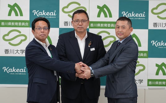 写真左から、香川大学 理事・副学長 野崎武司氏、香川県教育委員会 教育長 淀谷圭三郎氏、株式会社KAKEAI 代表取締役社長 兼CEO 本田英貴