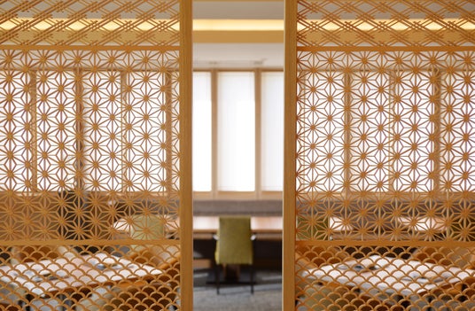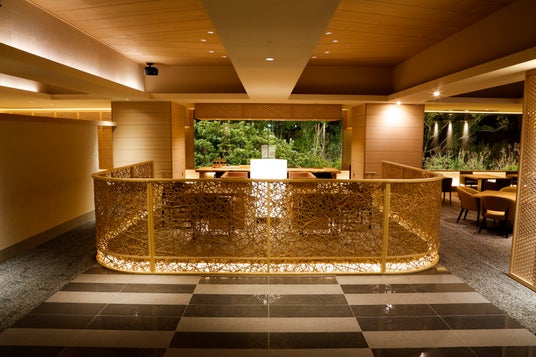 さらに、レストラン内のパーテーションは、細くひき割った木に溝・穴・ホゾ加工を施しカンナやノコギリ、ノミ等で調節しながら1本1本組付けしていく遠く飛鳥時代から長い年月をかけて磨きぬかれた木工技術「組子」が施され、麻の葉や清海波などの4種類の組子模様もお楽しみいただけます。