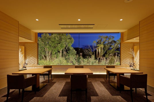 三重県松阪市産の樹齢250年の檜が使用された一枚板の割烹カウンターにある大きな窓の外は、山桃や樫、楠、白樫など常緑樹が中心で夜はライトアップされ、レストランが森に浮かんでいるような感覚でお食事をご堪能いただけます。ぜひ、ご宿泊と併せてご利用ください。