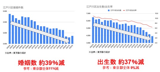 その一方で、東京都における総人口はこれまで増加傾向にありましたが、2030年をピークに減少フェーズに入ることが予想されています。(※3)その中でも江戸川区は都内全体平均と比較しても出生数・婚姻数の減少幅が突出して大きい状況です。(※4、5)