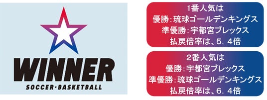 優勝・準優勝予想の1番人気は、優勝が2シーズンぶりに西地区制覇を果たしレギュラーシーズン勝率76.7%の琉球ゴールデンキングス、準優勝が2シーズン連続で東地区制覇を果たしレギュラーシーズン勝率80%の宇都宮ブレックスで、払戻倍率(オッズ)は5.4倍!2番人気は、優勝が宇都宮ブレックス、準優勝が琉球ゴールデンキングスで、払戻倍率(オッズ)は6.4倍、3番人気は、優勝が宇都宮ブレックス、準優勝が2シーズン連続で中地区制覇を果たしレギュラーシーズン勝率79.7%の三遠ネオフェニックスで、払戻倍率(オッズ)は7.1倍、となっています。
