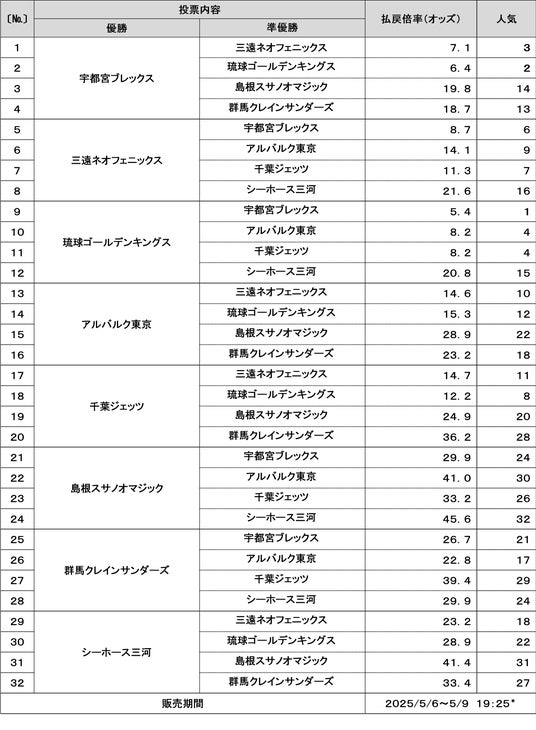 優勝・準優勝チーム予想は5月9日(金)19時25分まで販売