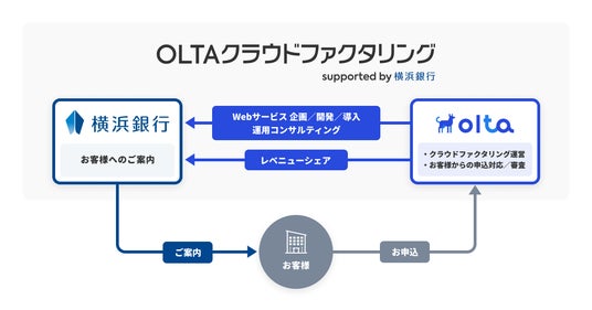 OLTAと横浜銀行とのクラウドファクタリング事業における提携では、OLTAがWebサービスの企画・開発・導入および運用におけるコンサルティングを横浜銀行に提供し、横浜銀行は法人・個人事業主のお客様にサービスをご案内します。