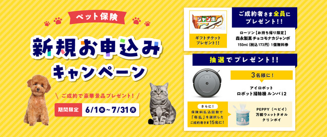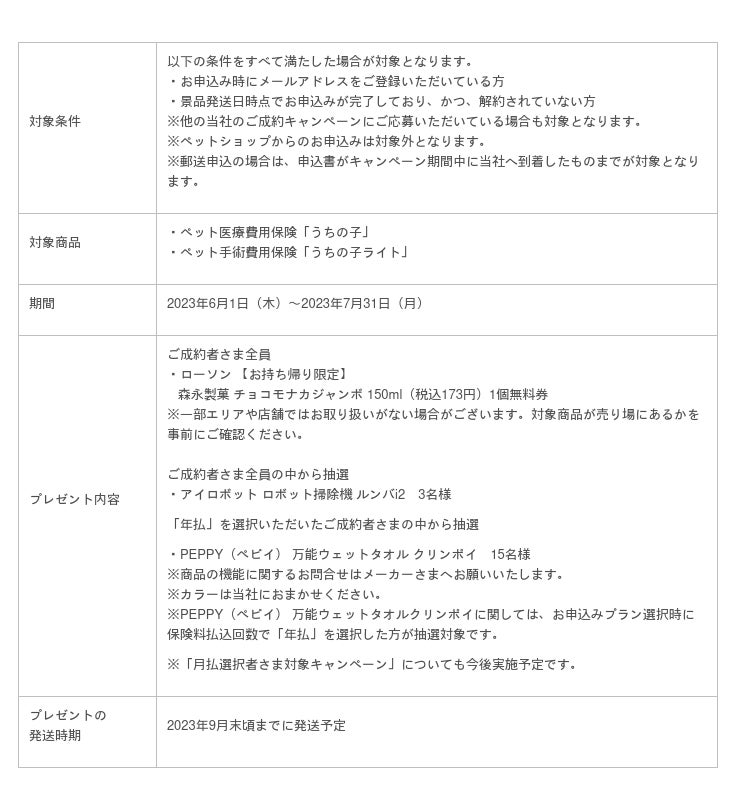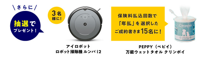 本キャンペーンは、期間中にペット保険にお申込みいただいたご成約者さま全員に、ローソン店舗で「森永製菓 チョコモナカジャンボ」と引き換えできる電子ギフトチケットをプレゼントします。また、抽選で3名様に人気のロボット掃除機が当たるほか、さらに、保険料払込回数で「年払」を選択いただいたご成約者さまの中から抽選で15名様に人気のペット用品が当たります。