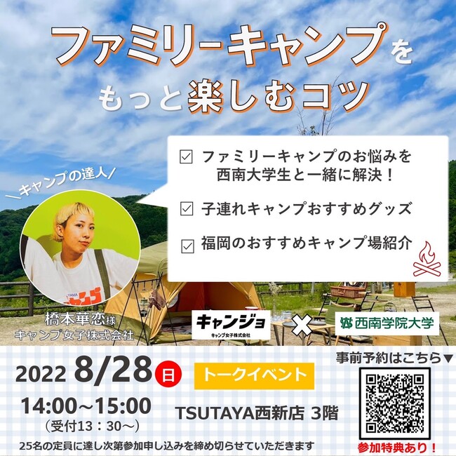 西南学院大学(福岡市)とキャンプ女子株式会社(本社:福岡市)、カルチュア・コンビニエンス・クラブ株式会社(以下、CCC)が運営するTSUTAYA 福岡西新店および同店舗に併設する「SHARE LOUNGE(シェアラウンジ)」との産学連携プロジェクトの一環として、西南大学商学部・三井ゼミの学生の皆さんと商品プロモーション・マーケティング実践を行いました。