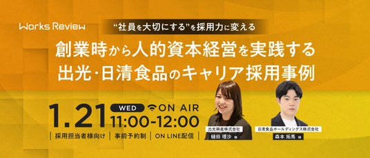 株式会社ワークス・ジャパン(本社:東京都千代田区、代表取締役:清水信一郎)は、2026年1月21日(水)に、企業の人事・人材開発担当者や人事責任者を対象にしたオンラインフォーラム、WORKS REVIEW『“社員を大切にする”を採用力に変える ― 創業時から人的資本経営を実践する出光・日清食品のキャリア採用事例』を開催します。